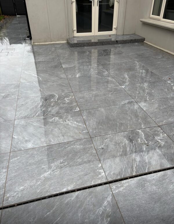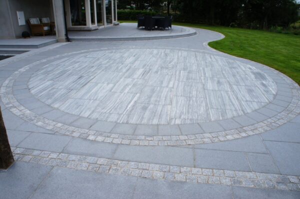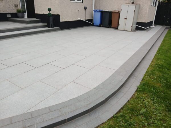 Italian Florence porcelain with a tumbled silver granite cobble border. Flamed silver granite kerbs used for the step risers. Work completed by McAteer Paving