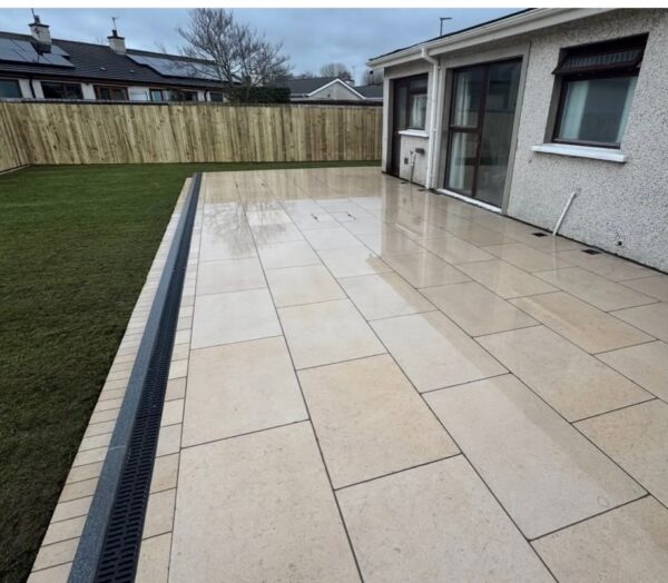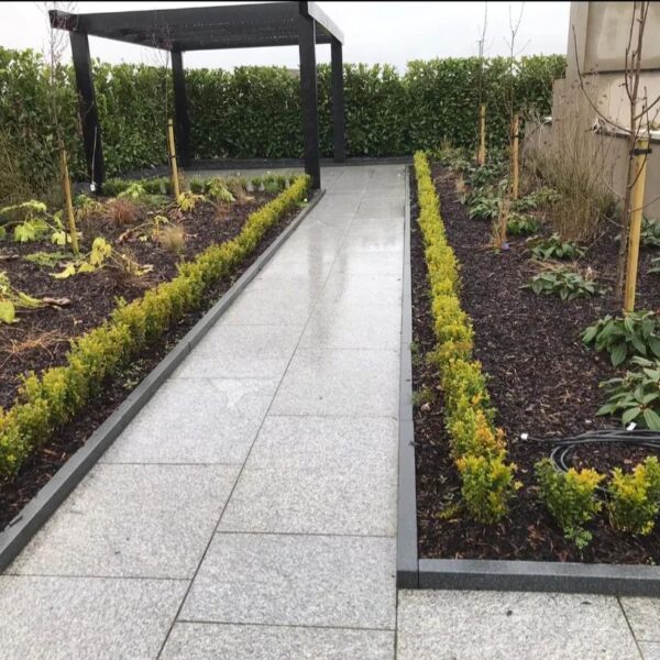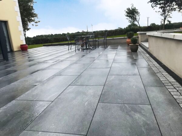 Blue Granite porcelain with a black granite cobble border and black granite kerb riser. Work completed by Barry Thompson