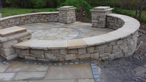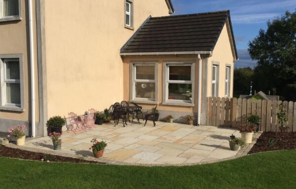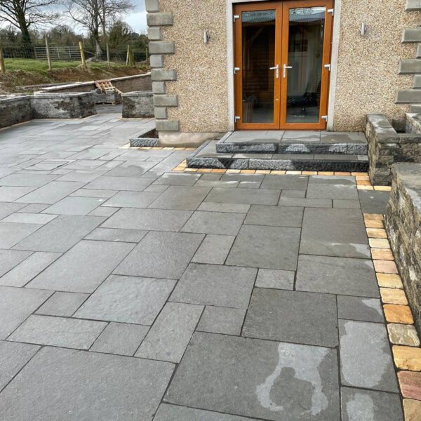 Tinted Mint Paving with a black limestone cobble border. 60mm Tinted Mint Wall Copings are complemented perfectly with the Tumbled Donegal Sandstone building stone