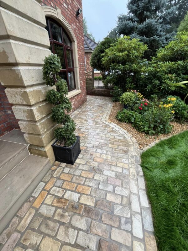 Travertino Porcelain, Tinted Mint Sandstone Cobbles, Bespoke Donegal Sandstone Steps