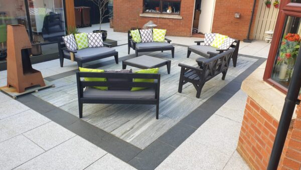 Blue Granite paving with a nero santiago feature edged with a split silver granite cobble. Steps have been formed using bullnosed blue granite.