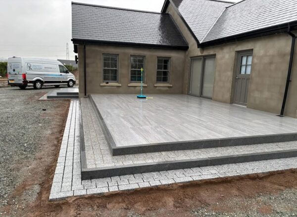 Blue Centre Porcelain tiles with a Silver Granite Kerb used as risers. Work completed by Tulnacross paving