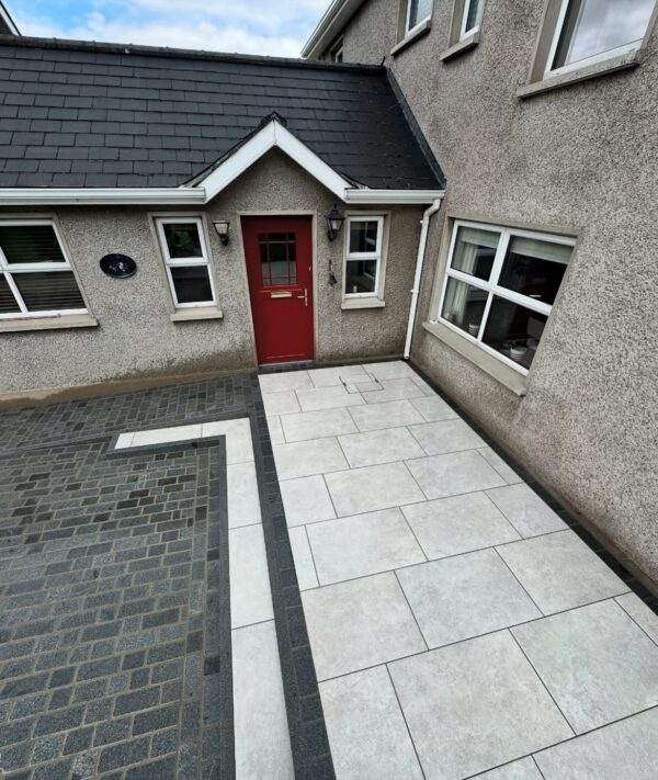 Regale Chinele 1200x600x20mm tiles with a 900x200x20mm anthricite porcelain border. Kerb risers are 2000x200x75mm blue granite. Work completed by CJ Paving Contracts