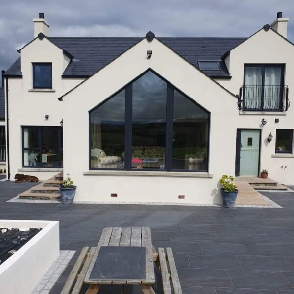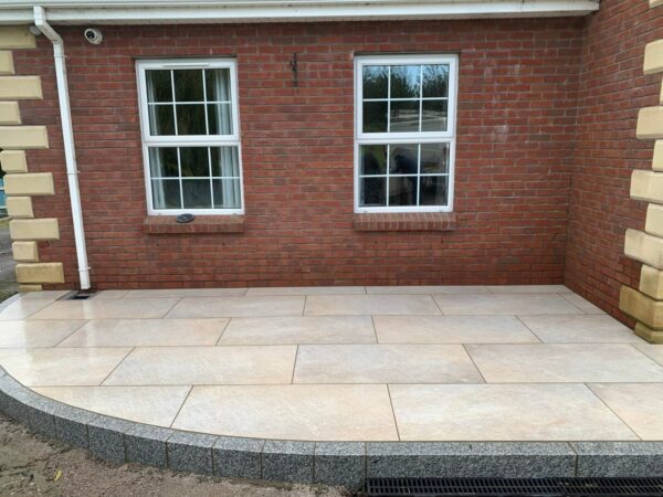 Patio area complete and ready for summer!! Amac Paving done a great job using one of our newest tiles alongside a silver granite kerb.We currently have one of the largest stocks of porcelain paving in the country!!All our products can be viewed at our display yard outside Dungannon.